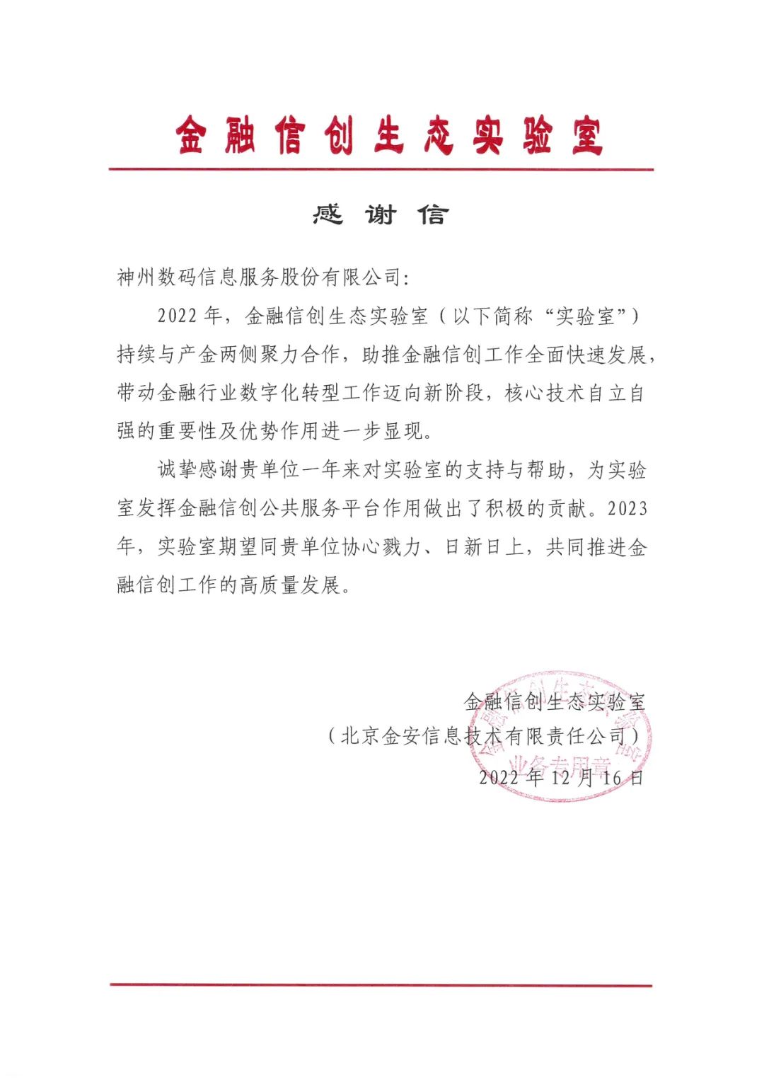 金融信创生态实验室感谢信